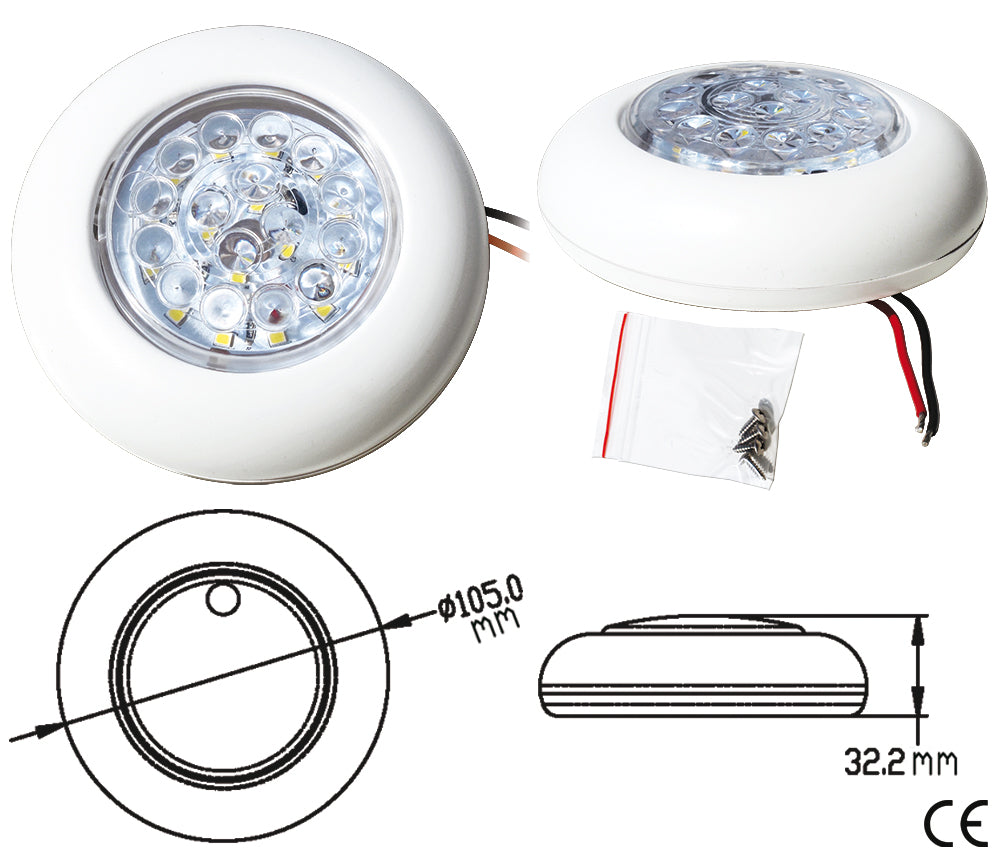 Plafoniera a 16 LED a luce fredda con sistema di accesione e spegnimento a pressione. Corpo materiale plastico resistente agli spruzzi, completa di viti per il fissaggio. Montaggio a superficie. Testata in conformità alla normativa comunitaria CE e RoHS 2004/108/EC. |
